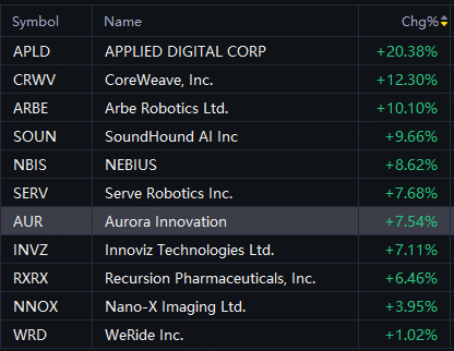 APLD up 20%; CoreWeave up 12%; SoundHound AI up 10%; Nebius up 9%; Serve Robotics up 8%; RXRX up 6%.
