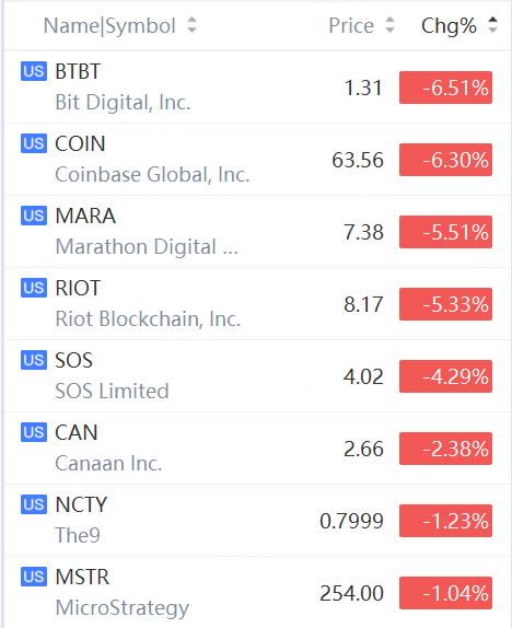 Coinbase, Bit Digital fell over 6%; Marathon Digital, Riot Blockchain fell more than 5%; SOS Limited fell more than 4%.