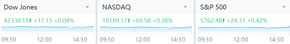 The Dow Jones Industrial Average rose 17.15 points, or 0.04%, to 42,330.15, the S&P 500 rose 24.31 points, or 0.42%, to 5,762.48 and the Nasdaq Composite rose 69.58 points, or 0.38%, to 18,189.17.
