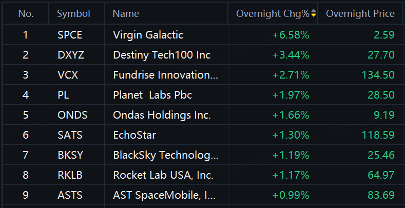 Space stocks and ETFs jumped in overnight trading. Virgin Galactic up over 6%; DXYZ, VCX up around 3%; Planet Labs up 2%; Ondas Holdings, EchoStar, BKSY up over 1%.