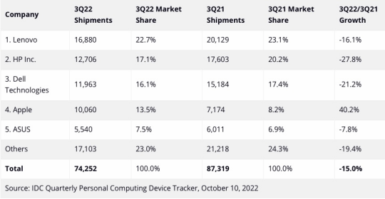 The total PC market declined to 74.3M units in the third-quarter, down from 87.32M units in the third-quarter of 2021, as demand continued to decline following the early days of the COVID-19 pandemic and uneven supply.