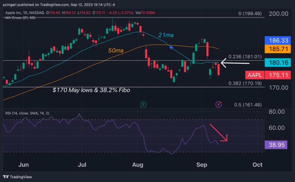 Shifting from the intraday chart to the daily chart, we observe that Apple’s stock prices have struggled to breach the 21-day moving average resistance, situated around $180. This resistance level has proven a big hurdle, as it was tested but never broken over the last three market sessions.