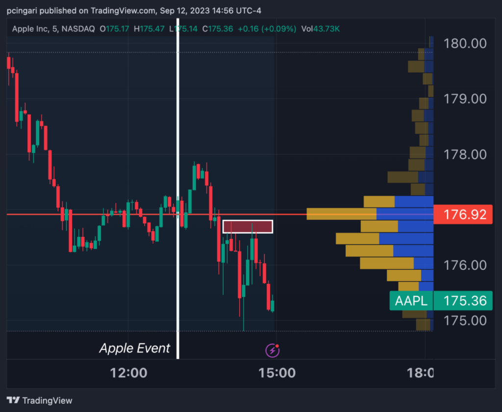 Intriguingly, when examining the 5-minute intraday chart, it becomes evident the stock’s decline intensified during the Apple Wonderlust Event. This suggests that the market didn’t initially warm up to Apple’s new product offerings.