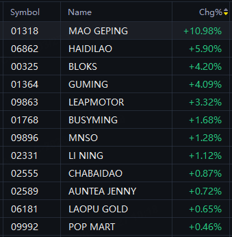 Maogeping up 11%; Haidilao up 6%; Bloks, Guming up 4%; Leapmotor up 3%; Pop Mart up 0.5%.