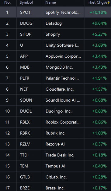 AI Software Shares Kept Rally in Premarket. Spotify and Datadog up 10%; Shopify up 5%; Unity, AppLovin and MongoDB up 3%; Palantir and Cloudflare up 2%.