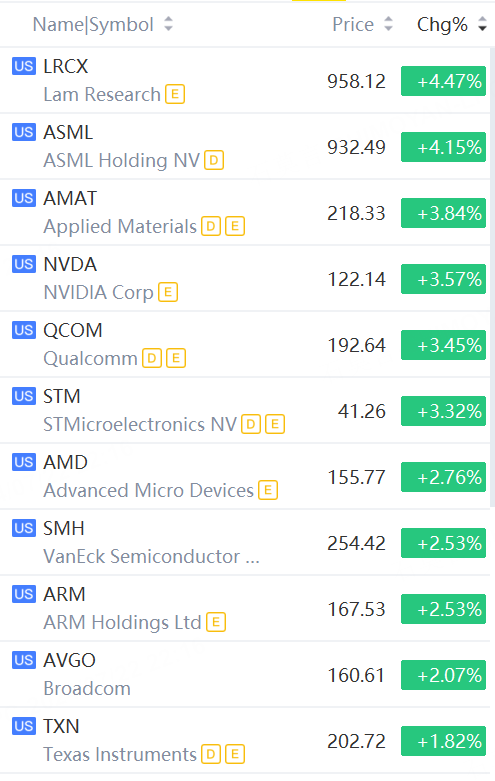 ASML rose 4%; Nvidia, Qualcomm, STM rose more than 3%; AMD, Arm, Broadcom rose over 2%.