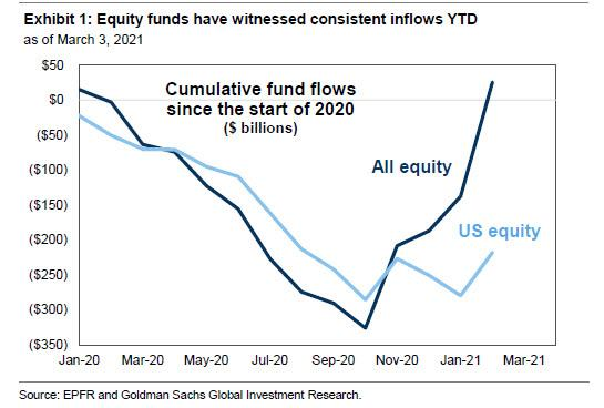 尽管近期美国国债收益率的上涨在很大程度上打压了股票价格,但与年初相比,过去几周流入股票基金的速度加快了。