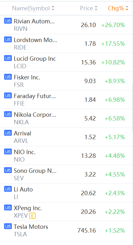 Tesla, Rivian, $Lucid(LCID)4, NIO, Xpeng, Li Auto, Arrival, Nikola, and Canoo rose between 1% and 17%.