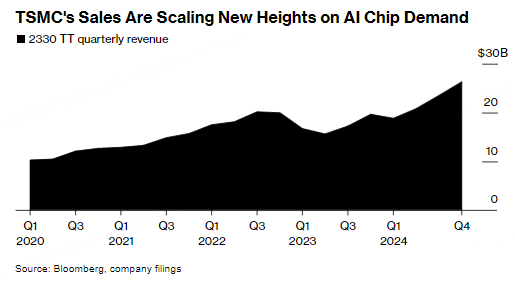 Taiwan Semiconductor Manufacturing Co. projected quarterly sales and capital expenditure ahead of analysts’ estimates, fueling hopes that spending on AI hardware should remain resilient in 2025.
