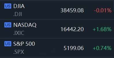 The Dow Jones Industrial Average fell 2.43 points, or 0.01%, to 38,459.08, the S&P 500 gained 38.42 points, or 0.74%, to 5,199.06 and the Nasdaq Composite added 271.84 points, or 1.68%, to 16,442.20.