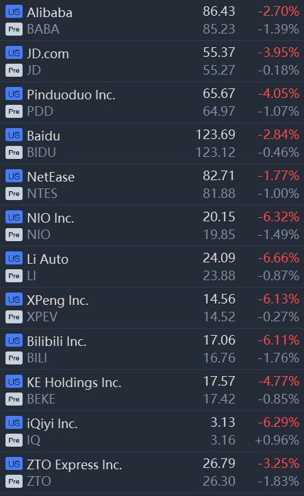 Some hot chinese ADRs slid in premarket trading. Alibaba, Pinduoduo, NetEase, Nio, Li Auto and Bilibili fell about 1%.
