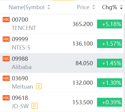 Tencent jumped 5.18 per cent to HK$365.2 while Alibaba Group gained 1.45 per cent to HK$84.05. Sunny Optical advanced 2.9 per cent to HK$94.80 while chip maker SMIC rose 2.5 per cent to HK$18.84. Sun Hung Kai Properties added 0.8 per cent to HK$107 and Henderson Land rose 0.6 per cent to HK$26.85, leading gains among Hong Kong developers.