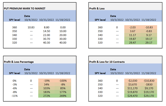 Let us also have a look at the November 18 360 strike puts and get a sense of how the mark-to-market would look like (the analysis is run utilizing a binomial options pricing methodology):