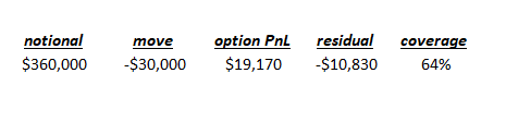 If we have a portfolio entirely invested in the S&P 500 and a $360k notional, then a move to 3,300 would generate a loss around -30k which would be offset by a gain of 19k from the 10 contracts bought above. Hence, the portfolio loss would not be entirely covered, only 64% of the downside move. The reason for this coverage is the expensive options pricing.