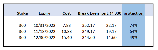 The current pricing needs a significant front-ended drop for the options to be profitable. For example, if the S&P 500 moves to 3,300 by the end of October, then the put option offers a 183% pay-off (i.e. the premium moves from 10.8 to 30.7, which results in a gain of 19.87 per contract). Conversely, if the price stays at 360 the profit and loss is -19% due to the option decay.