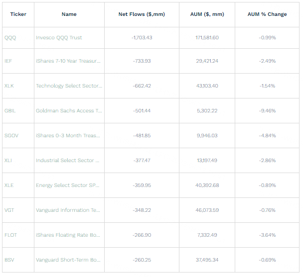 QQQ was joined on the biggest outflows list for the week by the Technology Select Sector SPDR Fund (XLK), which lost $662.4 million, and the Vanguard Information Technology ETF (VGT), which dropped $348.2 million. While inflation has slowed considerably, it looks like investors are still wary of technology.