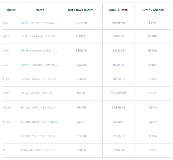 The JPMorgan Alerian MLP Index ETN (AMJ) gained $2.4 billion last week, likely drawing investor interest due to the announcement earlier this month that OPEC+ would be cutting its production targets more than originally planned.