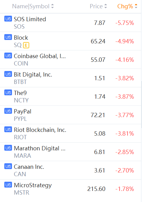 Marathon Digital, Riot, Coinbase, Bit Digital, Block, and SOS Limited fell between 2% and 6%.