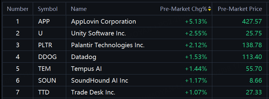 AI application software stocks rose in overnight trading. AppLovin up over 5%; Unity, Palantir up over 2%.