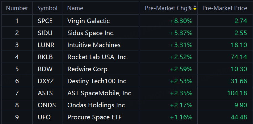 Space stocks rallied in overnight trading with Virgin Galactic up over 8%; Sidus Space up over 5%; Intuitive Machines up over 3%; Rocket Lab, Redwire, DXYZ up over 2%.