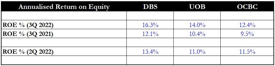 For this financial metric, DBS stands above the rest with its ROE for 3Q2022 exceeding 16%.