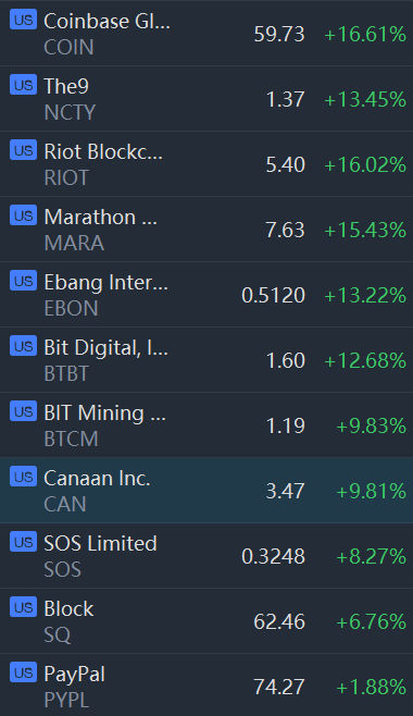 Crypto stocks rallied in morning trading. Coinbase, The9, Riot Blockchain, Marathon Digital, Ebang Internationa, Bit Digital, BIT Mining, Canaan, SOS Limited and Block climbed between 6% and 17%.