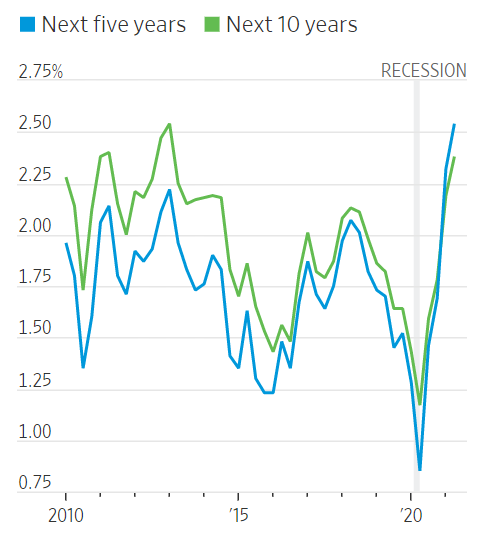In another twist, the five-year break-even rate, which currently trades around 2.58%, has surpassed the 10-year rate, which sits around 2.43%. In contrast, the Labor Department’s main gauge ofconsumer prices jumped 5.4% in Junefrom the 12 months prior—the biggest rise in prices recorded since August 2008.