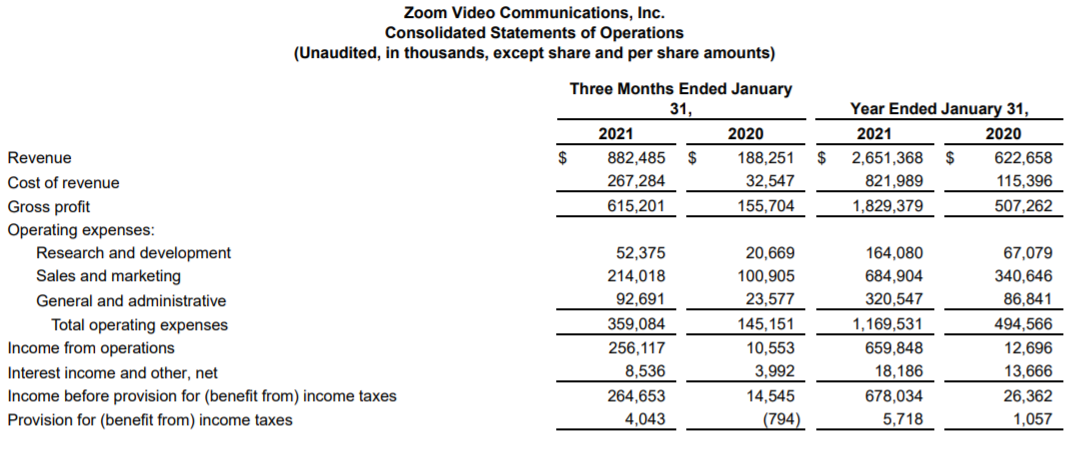 Zoom全年归属于普通股股东的净利润为6.715亿美元,每股摊薄收益为2.25美元,相比之下去年同期归属于普通股股东的净利润为2170万美元,每股摊薄收益为0.09美元。