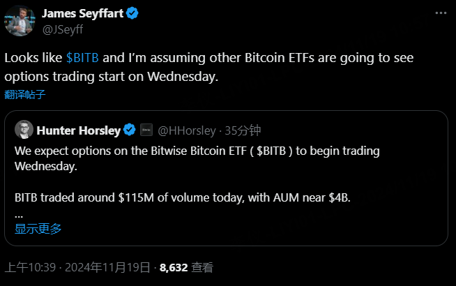 对此彭博 ETF 分析师 James Seyffart 表示:“看起来 BITB 和我猜测的其他比特币 ETF 将于周三开始期权交易。”