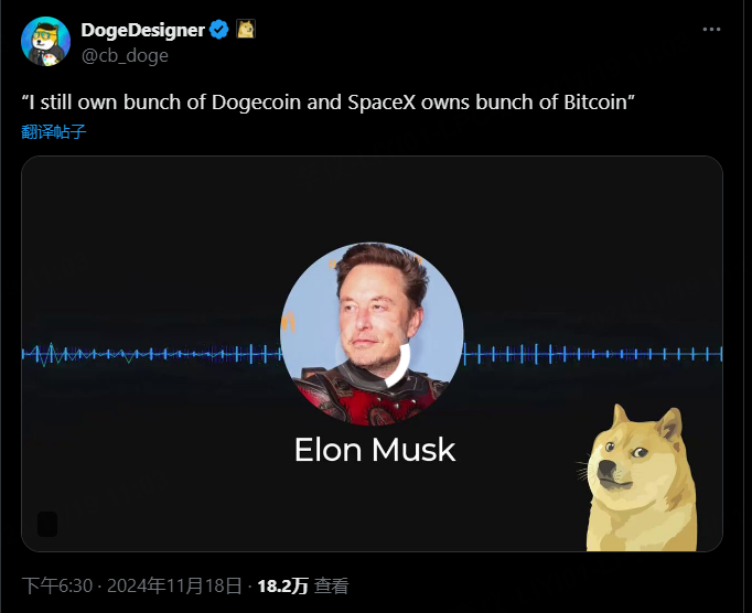 ● 马斯克:仍持有很多Dogecoin,SpaceX也仍持有比特币