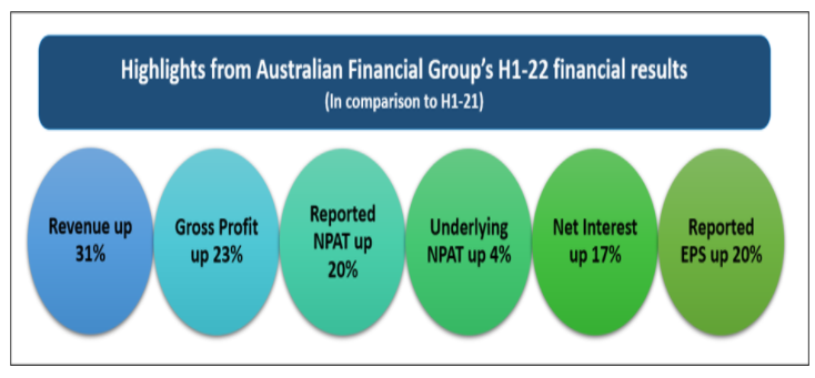 Shares of Australian Financial Group(ASX:AFG)moved up to 4.93%, trading at AU$2.340 a share (25 February 2022, 11 AM AEDT). The shares have turned north post the financial company’s result announcement for first half of 2022.