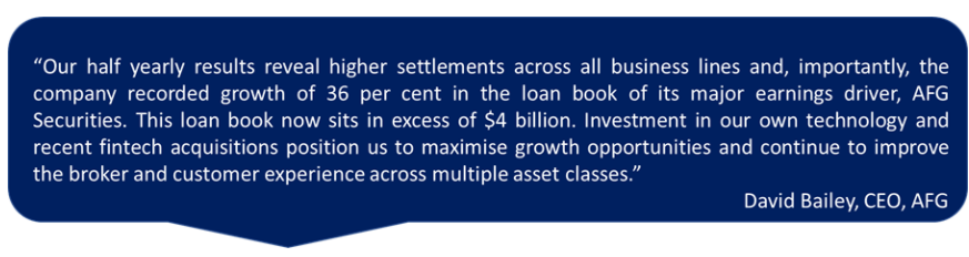 AFG’s residential settlements were up 47% on prior period and revenue from aggregation segment soared 35%. AFG Security’s loan book expanded 36.1% and AFG Home Loans white label settlements were up 46% on prior period. As a result,Underlying NPATfrom continuing operations was up 4.4% on prior comparative period.