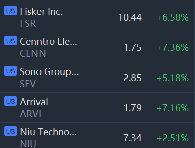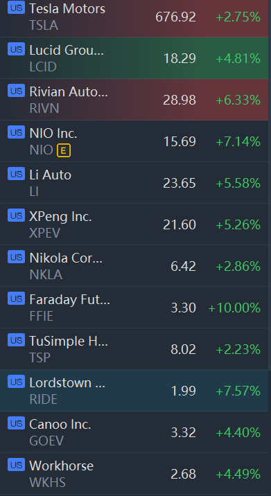 EV stocks climbed in morning trading. Tesla, Lucid, Rivian, Nio, Xpeng Motors, Li Auto, Nikola, Faraday Future and Lordstown rose between 2% and 10%.