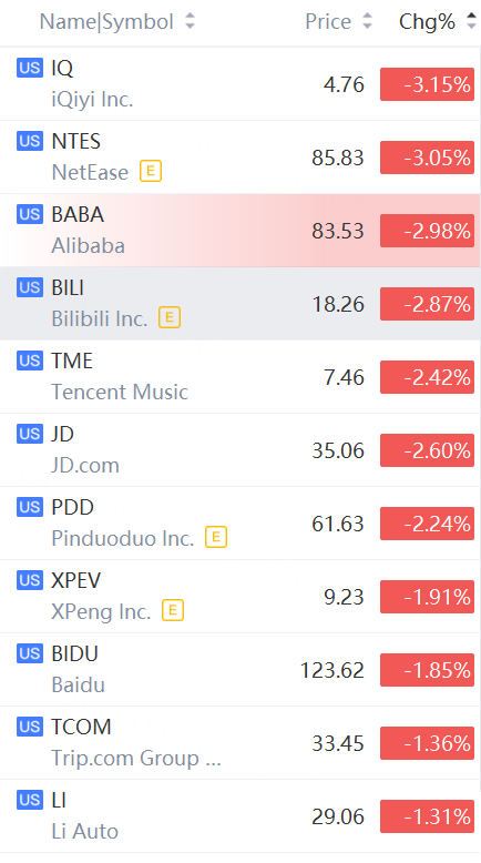 Alibaba, iQiyi, NetEase dropped about 3%; Bilibili, Pinduoduo, JD.com fell more than 2%.