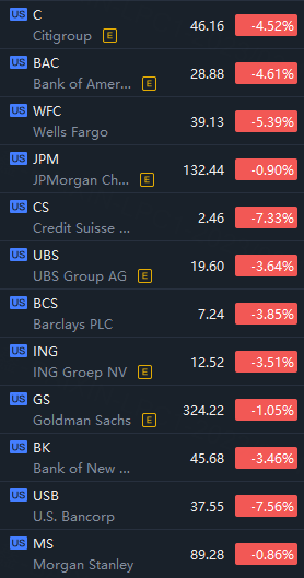 Bank stocks tumbled in morning trading with Credit Suisse and U.S. Bancorp slumping over 7%.