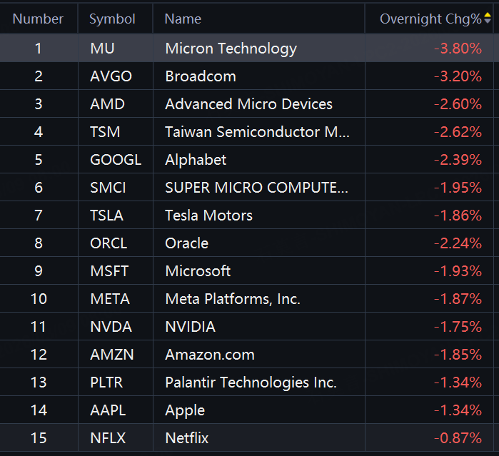 Big tech stocks fell in overnight trading. Micron, Broadcom down over 3%; AMD, TSMC, Alphabet, SMCI, Tesla, Oracle, Microsoft, Nvidia, down around 2%.