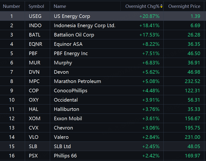 Oil stocks surged in overnight trading. US Energy up over 20%; Indonesia Energy up over 18%; Battalion Oil up over 17%; MPC up 5%; Occidental up 4%.