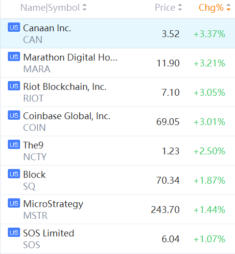 Coinbase, Block, Canaan, Riot Blockchain, MicroStrategy and Marathon Digital rose between 1% and 3%.