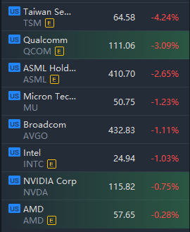All major semiconductor stocks remained red in morning trading, with Taiwan Semiconductor Manufacturing falling over 4% and Qualcomm falling over 3%.