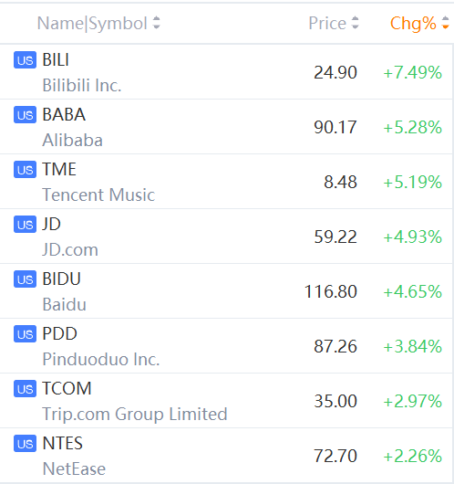 Bilibili rose over 7%; Alibaba, JD.com rose about 5%; Baidu rose over 4%.