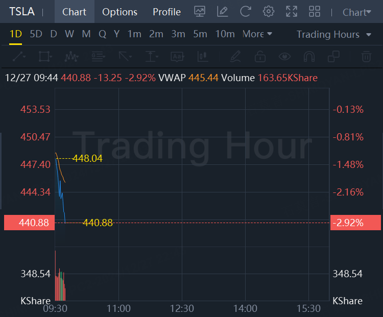 Shares of the electric vehicle-maker fell 2.92% to $440.88, extending losses from a day prior, when the stock fell 1.8%.