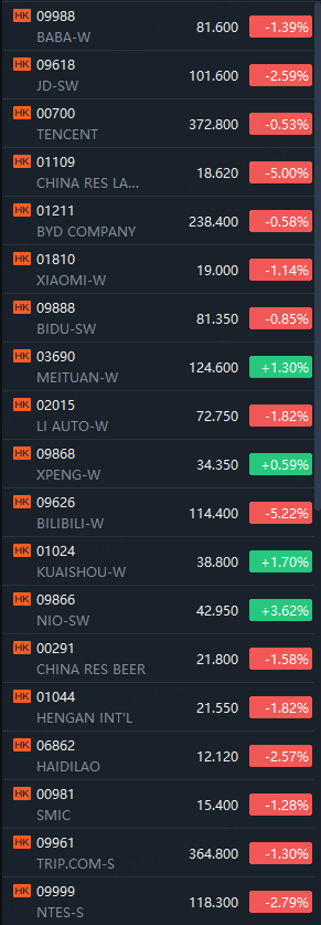 E-commerce company Alibaba Group Holding lost 1.3 per cent to HK$81.6, rival JD.com dropped 2.6 per cent to HK$101.60, while Tencent weakened 0.5 per cent to HK$372.80. EV giant BYD slipped 0.6 per cent to HK$238.40, while developer China Resources Land tumbled 5 per cent to HK$18.62.