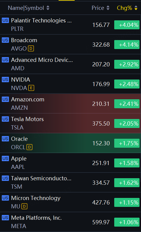 Big tech stocks rebounded on Monday. Palantir, Broadcom up 4%; AMD up 3%; Nvidia, Amazon, Tesla up over 2%.