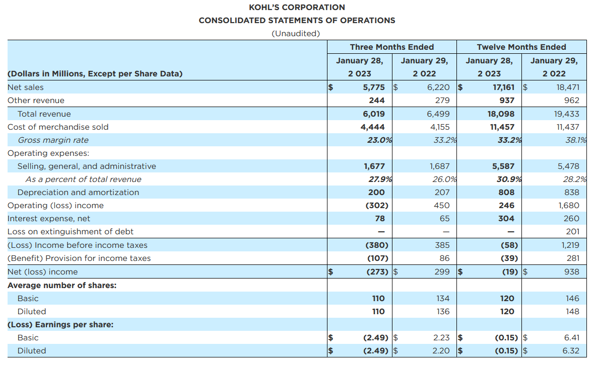 3月1日讯,科尔士百货公布了2022财年第四季度及全年财务业绩。财报显示,公司Q4营收同比下降7.4%至60.19亿美元。其中,净销售额同比下降7.2%至57.75亿美元,低于分析师预期的约60亿美元;可比销售额同比下降6.6%,逊于分析师预期的同比下降3.7%。