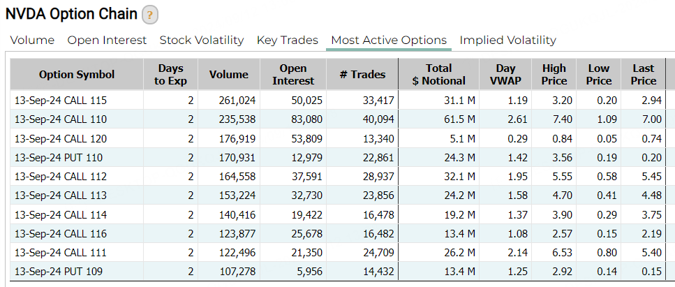 周三,美8月核心CPI环比增超预期,市场认为美联储下周不会大幅降息,美股上演V型大反弹,纳指涨逾2%。美股期权市场成交45,812,068张合约,其中看涨合约(CALL)占比56%,看跌合约(PUT)占比44%。