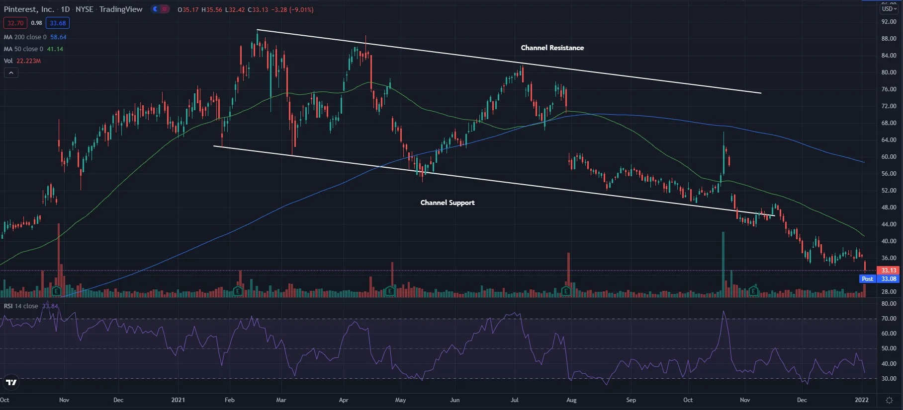 Analyst Michael Morris downgraded the stock from a Buy to a Neutral rating and lowered the price target from $46 to $39. This pushed Pinterest further below a technical channel it traded in.