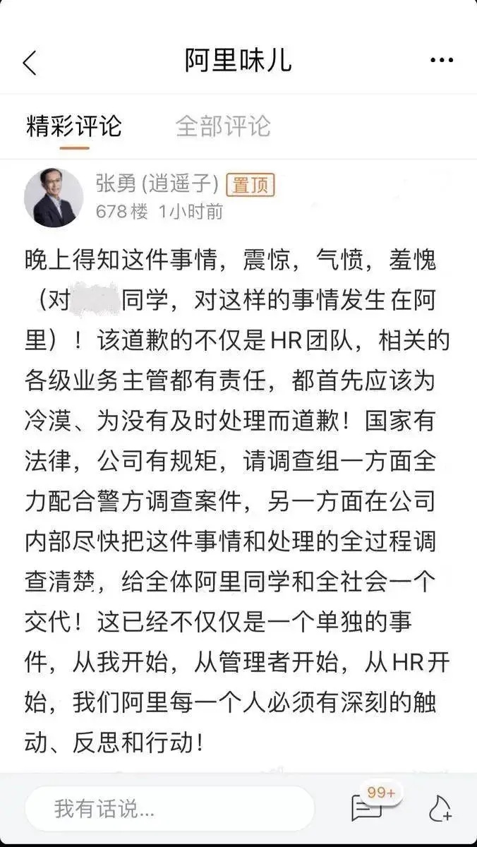 对此,阿里巴巴董事局主席兼CEO张勇8月8日凌晨在阿里内网发帖,用震惊、气愤、羞愧,表达对阿里一员工涉嫌侵犯女同事事件的感受。他同时表示: