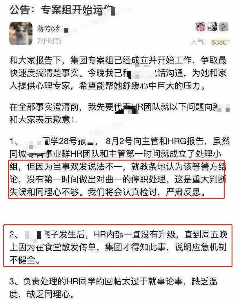 为此事中各级主管的冷漠和没有及时处理道歉。尽管警方仍在调查阶段,但阿里内部认为,事情在员工反馈后没有得到迅速的响应处理,存在重大问题。“从我开始,从管理者开始,我们每一个人必须有深刻的触动、反思和行动”。