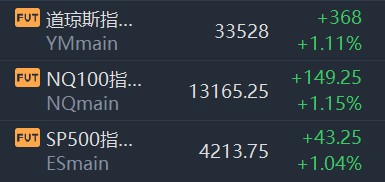 4月27日,美股三大股指期货短线拉升,道指期货涨1.11%,纳指期货涨1.15%,标普500指数期货涨1.04%。