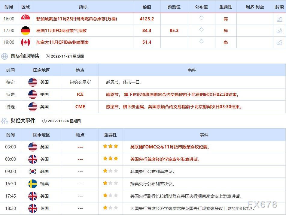 11月24日 周四关键词:美联储FOMC公布11月货币政策会议纪要、美股休市周四,经济数据方面,投资者可关注美国当周EIA天然气库存、德国IFO商业景气指数。